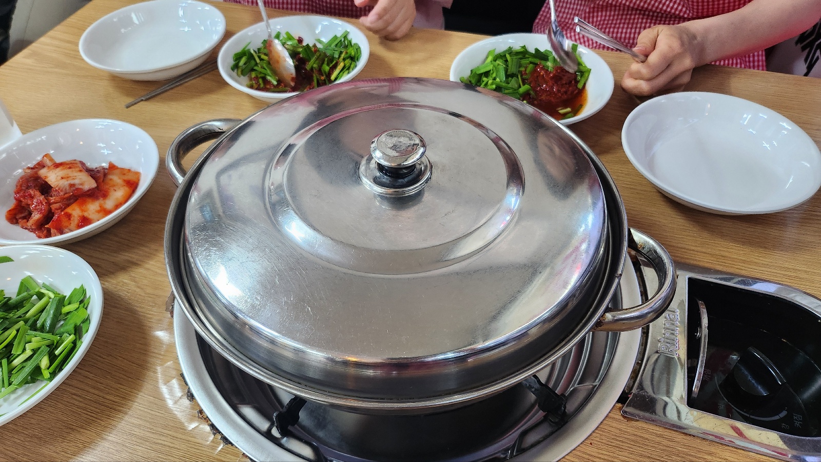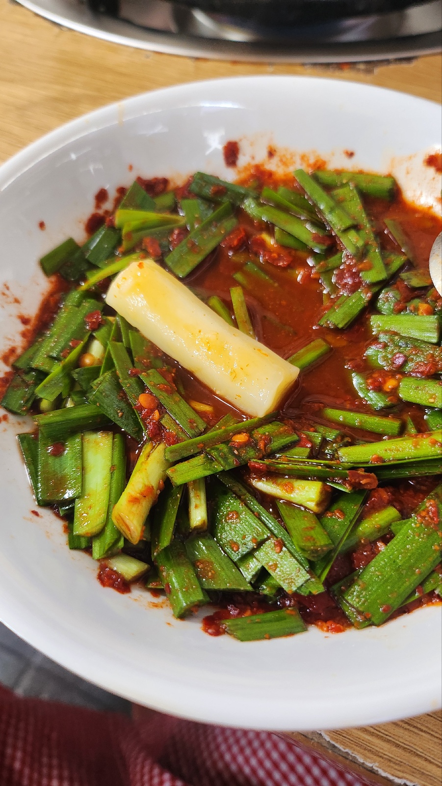 부추에 겨자와 양념장 소스를 넣어서 맛깔난 양념부추를 만들어 닭한마리가 빨리 뚜뚱뚜뚱 익어가기를 바랬어요.