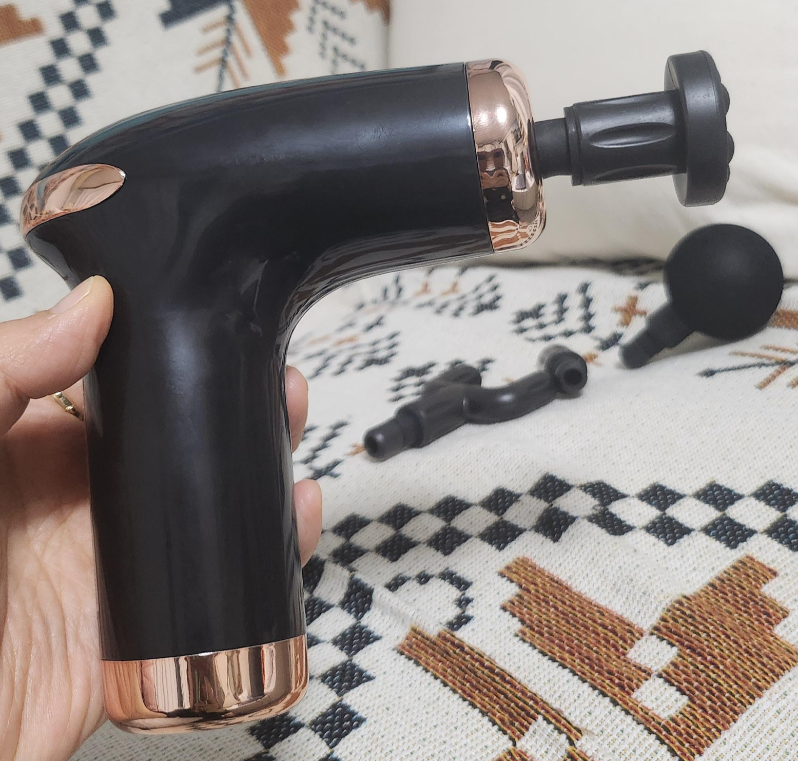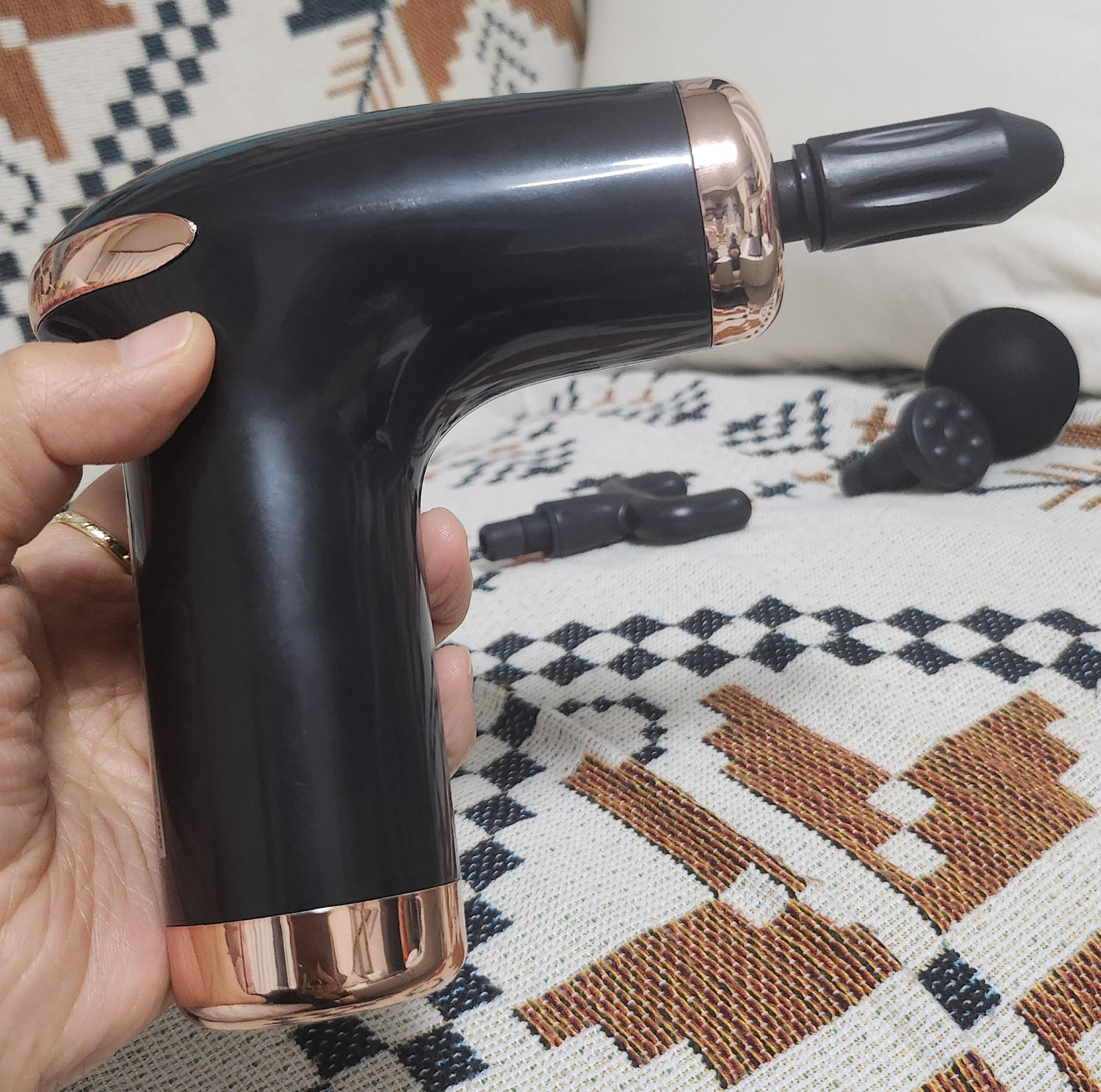 한 손에 쏙 들어오는 크기랍니다. 진동으로 마사지가 진행되는 권총모양의 맛사지 건입니다.
